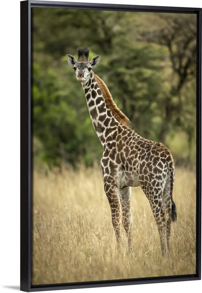 <p>Young Masai giraffe (giraffa camelopardalis tippelskirchii) stands in long grass by trees, Serengeti national park, Tanzania.</p>