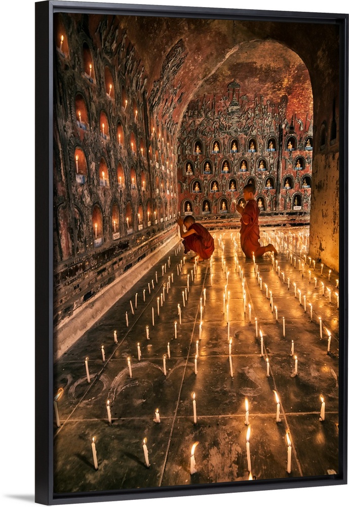 <p>Young monk praying with candles in his monastery in Myanmar.</p>