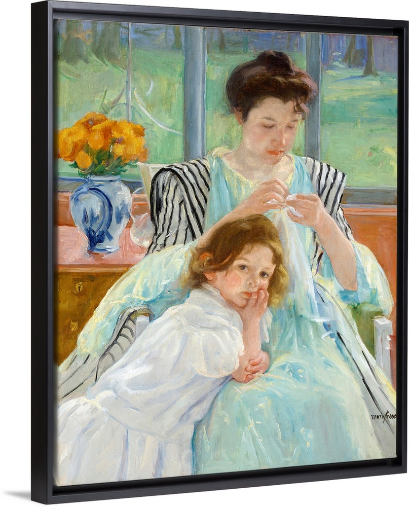 <p>In about 1890 Cassatt redirected her art toward women caring for children and children alone-themes that reflected her affection for her nieces and nephews and the prevailing cultural interest in child rearing. Cassatt enlisted two unrelated models to enact the roles of mother and child for this painting. Louisine Havemeyer, who purchased it in 1901, remarked on its truthfulness: Look at that little child that has just thrown herself against her mother's knee, regardless of the result and oblivious to the fact that she could disturb her mamma.' And she is quite right, she does not disturb her mother. Mamma simply draws back a bit and continues to sew.</p>