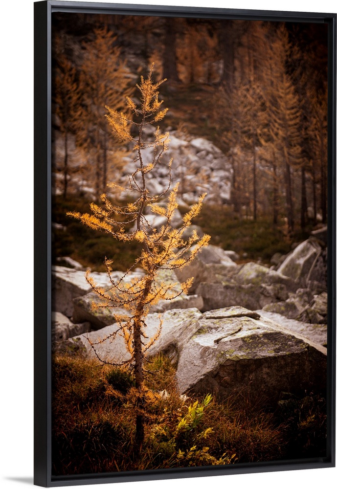<p>Close-up of a young alpine larch, in the mountains of British Columbia, Canada. There are large rocks, dry grasses, and more larches in the background. The photo is made at f2.8, to keep the small larch in focus and blur the background. Ursula Abresch Fall Collection.</p>