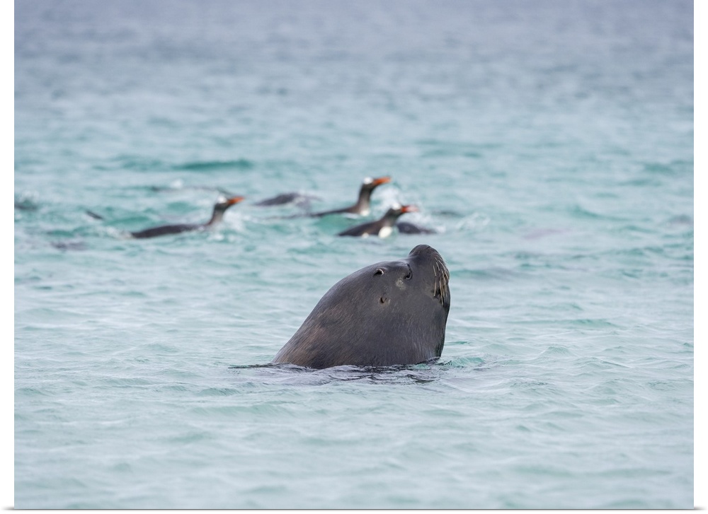 <p>Young southern sea lion bull hunting for Gentoo penguins. The hunt happens on the beach not in water, Falkland Islands.</p>