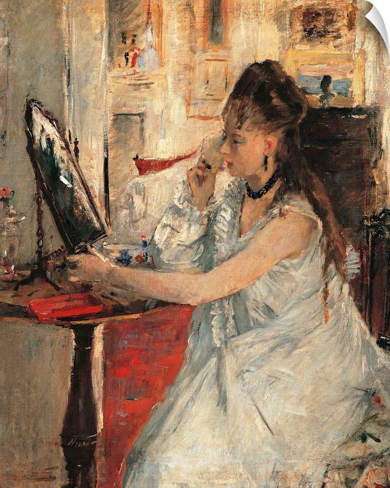 <p>Young Woman Powdering Her Face, by Berthe Morisot, 1877, 19th Century, oil on canvas, cm 46 x 30 - France, Ile de France, Paris, Muse dOrsay, RF1937-44. All. Young woman dressing room mirror room powder untied hair white table small pot flower necklace ea</p>