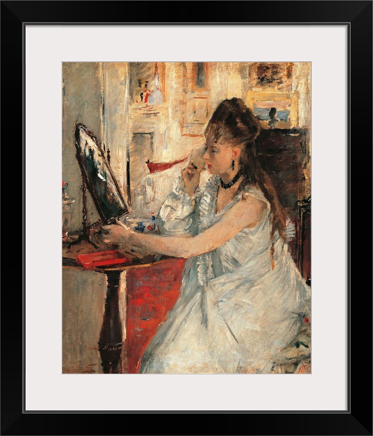 <p>Young Woman Powdering Her Face, by Berthe Morisot, 1877, 19th Century, oil on canvas, cm 46 x 30 - France, Ile de France, Paris, Muse dOrsay, RF1937-44. All. Young woman dressing room mirror room powder untied hair white table small pot flower necklace ea</p>