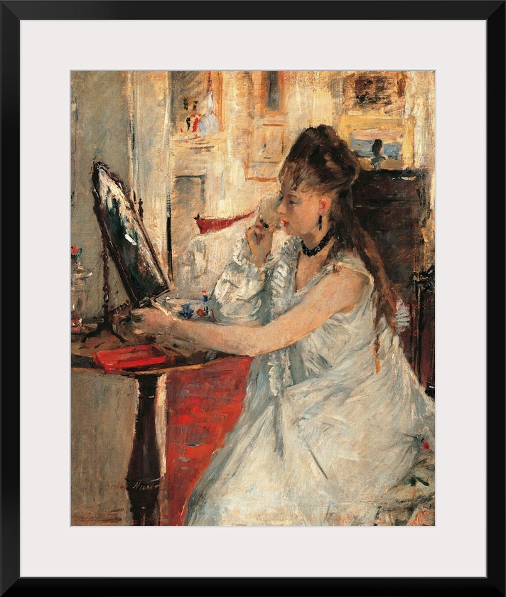 <p>Young Woman Powdering Her Face, by Berthe Morisot, 1877, 19th Century, oil on canvas, cm 46 x 30 - France, Ile de France, Paris, Muse dOrsay, RF1937-44. All. Young woman dressing room mirror room powder untied hair white table small pot flower necklace ea</p>