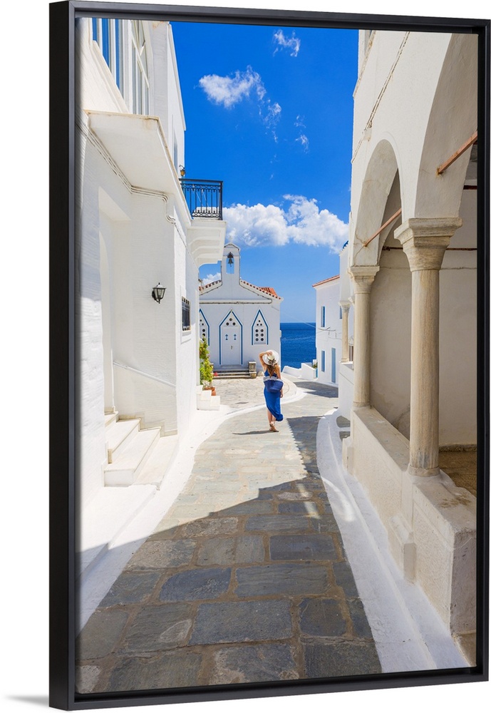 <p>Young woman walking on the street that leads to the Church of St. Barbara, Andros, Cyclades archipelago, Greece, Europe (MR).</p>
