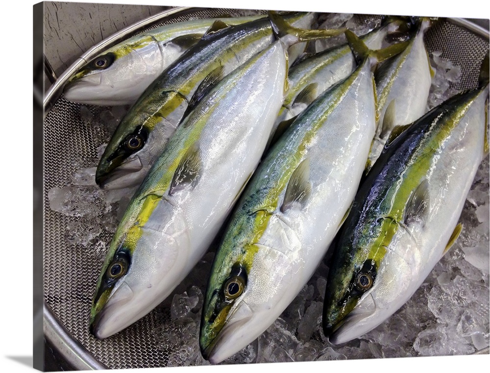 <p>Fresh fish, yellowtails over ice cubes.</p>