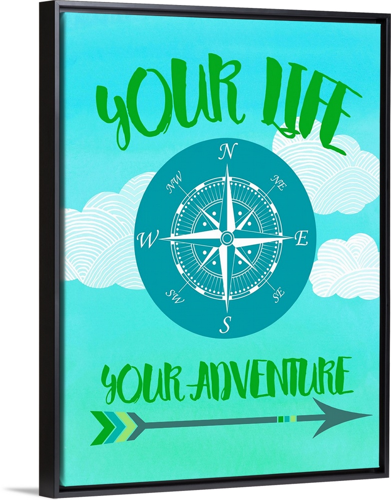 <p>"Your Life Your Adventure" written in green on a cloudy background with a compass rose in the center.</p>