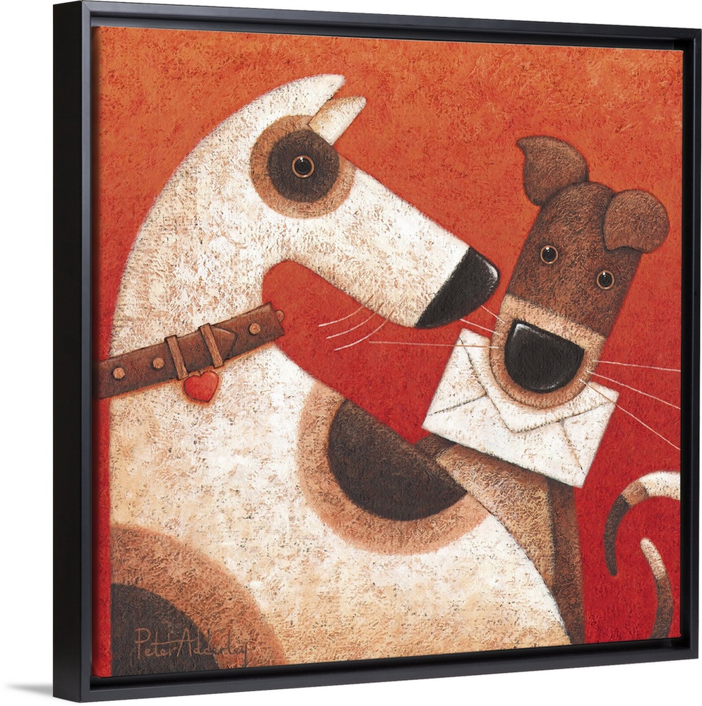 <p>Contemporary painting of two dogs, one of which has a letter in its mouth.</p>