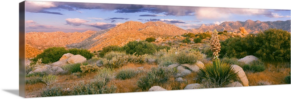 <p>Yucca (Spanish bayonet) plants blooming in a desert, Culp Valley Primitive Campground, Anza Borrego Desert State Park, California, USA.</p>