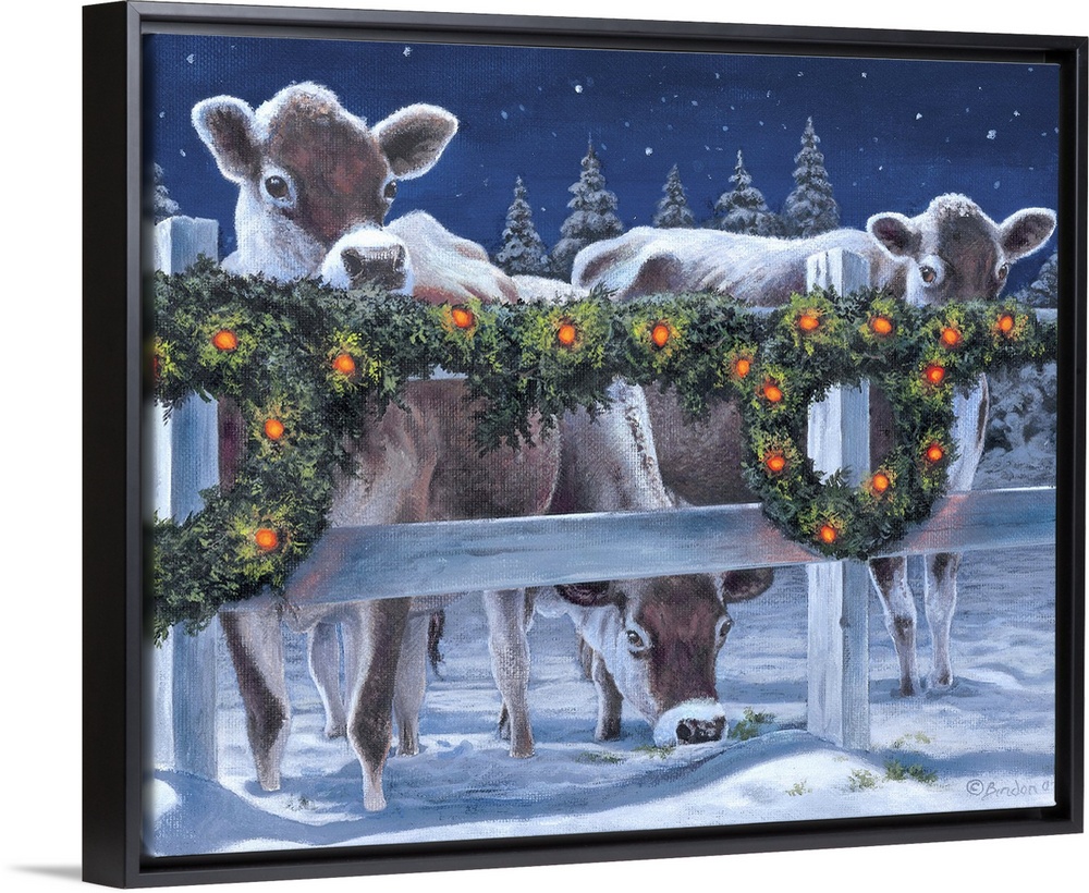 <p>Contemporary painting of cows standing behind a fence decorated for Christmas.</p>
