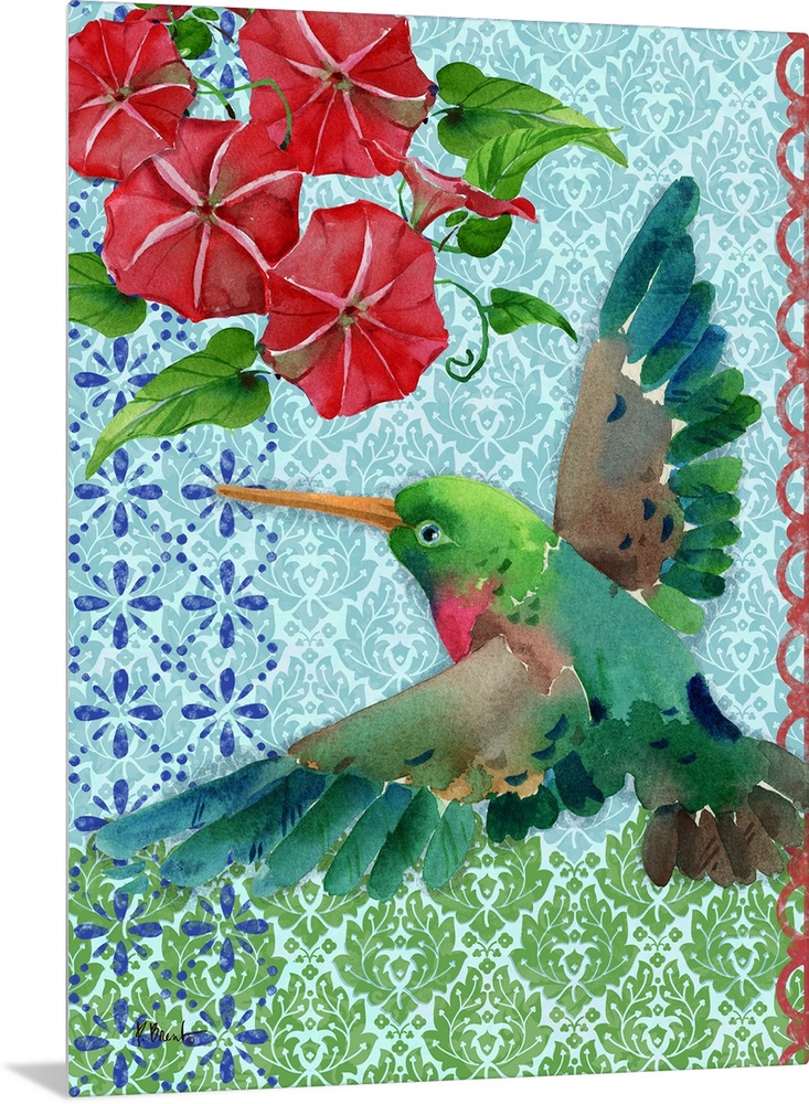 <p>Watercolor painting of a hummingbird in flight with red flowers in the top corner on a blue and green patterned background.</p>
