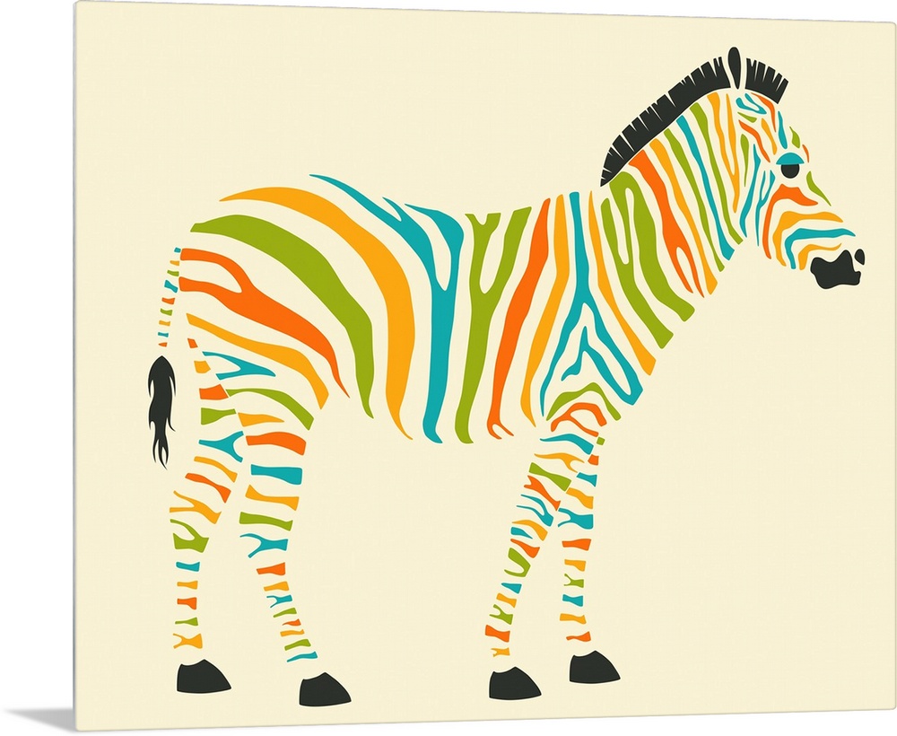 <p>Whimsical illustration of a zebra with colorful stripes on a cream colored background.</p>