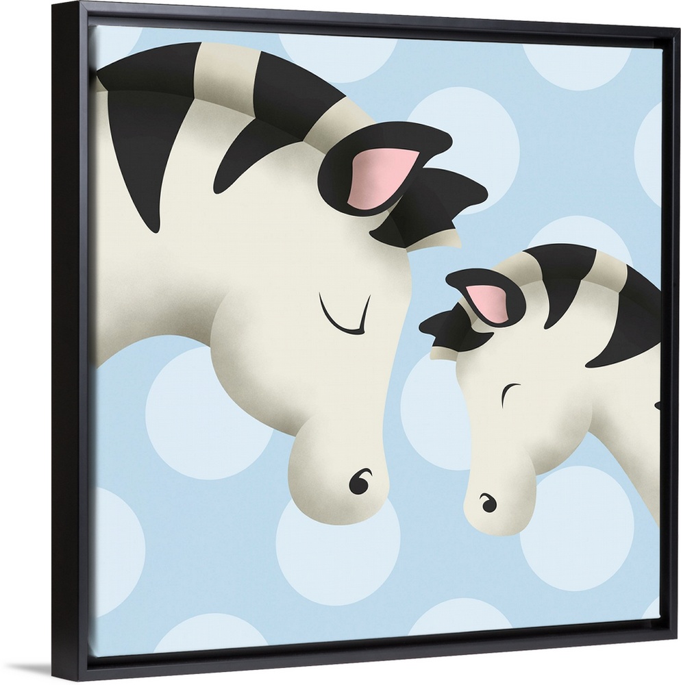 <p>Nursery art of a mother zebra and her baby on a blue polka-dot background.</p>