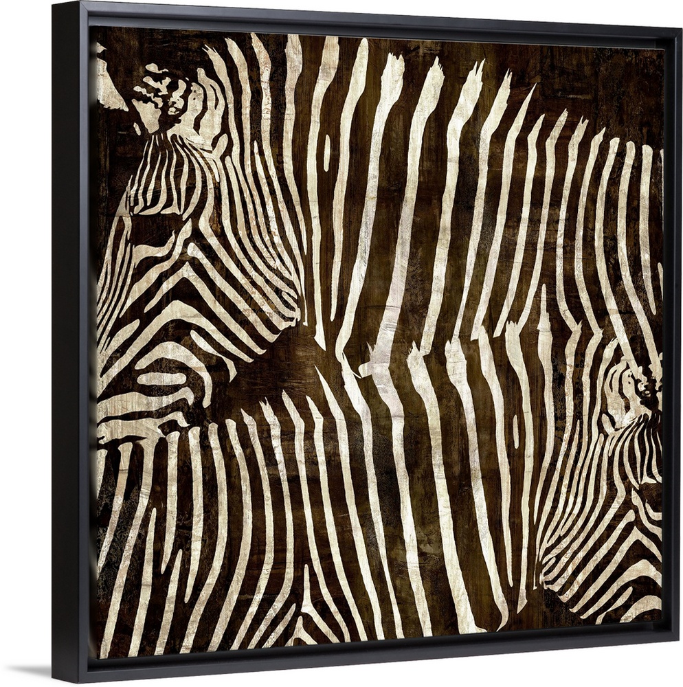 <p>Square wildlife decor with two zebras facing different directions on a brown background.</p>