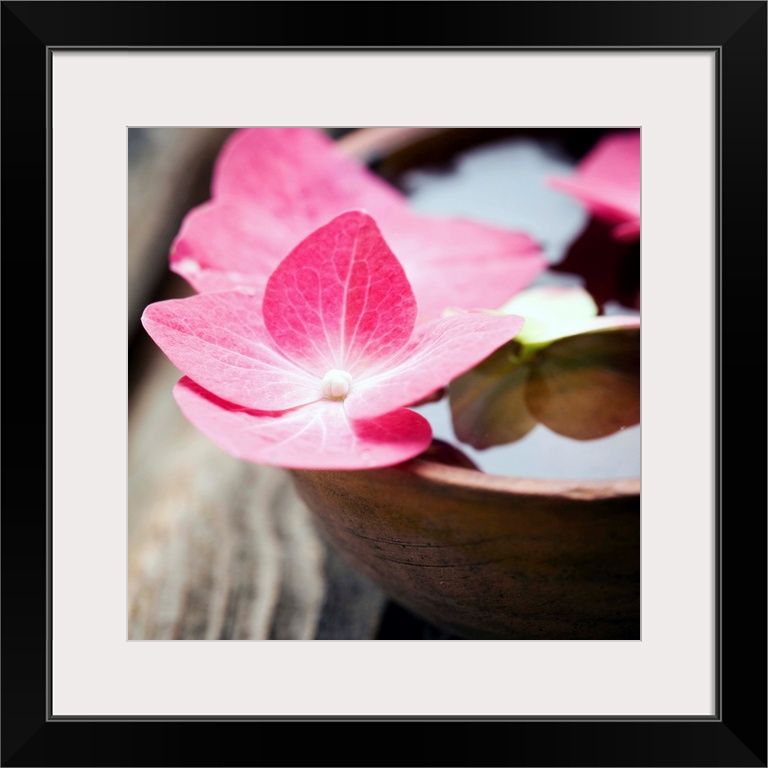 <p>A square photograph of pink flowers in a bowl of water.</p>