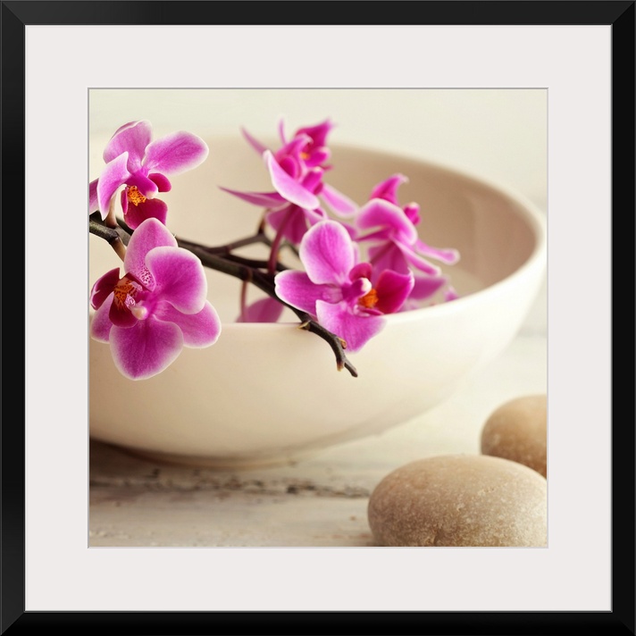 <p>A square photograph of pink orchids in a bowl with rocks next to it.</p>