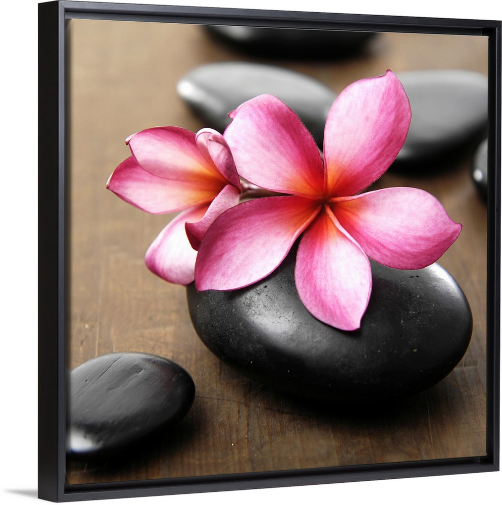 <p>Square image of pink flowers on smooth black rocks on wood.</p>