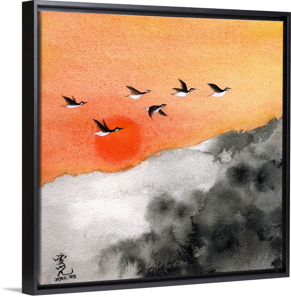 <p>Square painting of a warm sunset with birds flying through and a black and white landscape below.</p>