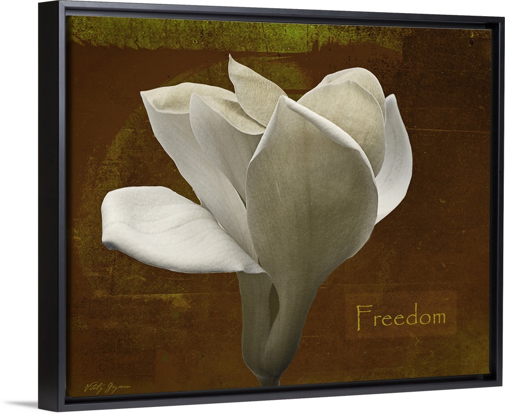 <p>Docor perfect for the home of a large white tulip against a distressed brown background with the text "Freedom" written to the side.</p>