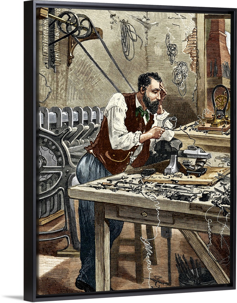 <p>Zenobe Gramme (1826-1901), Belgian electrical engineer in his workshop. Gramme was interested in improving the efficiency of electrical devices. In 1710 he demonstrated the Gramme machine, a continuous-current generator that produced large currents in relation to its size. At an exhibition in Vienna, Austria, a technician wired a series of such machines together incorrectly, so that the wires from one which was running were joined to one which was not. To the amazement of the onlookers, the second machine began to turn: the Gramme machine could act as both a generator and a motor. This allowed the possibility for work to be transferred large distances via electricity. Taken from Physique Populaire, 1891.</p>