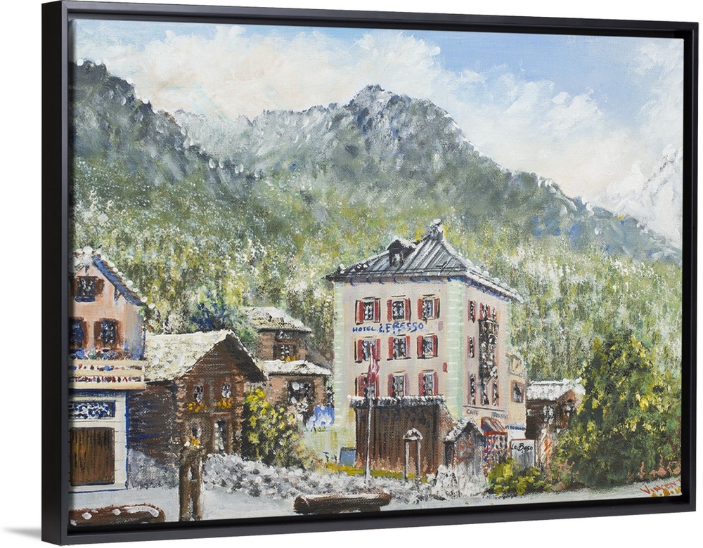 <p>Contemporary painting of a view of a village building with a mountain in the distance in Switzerland.</p>