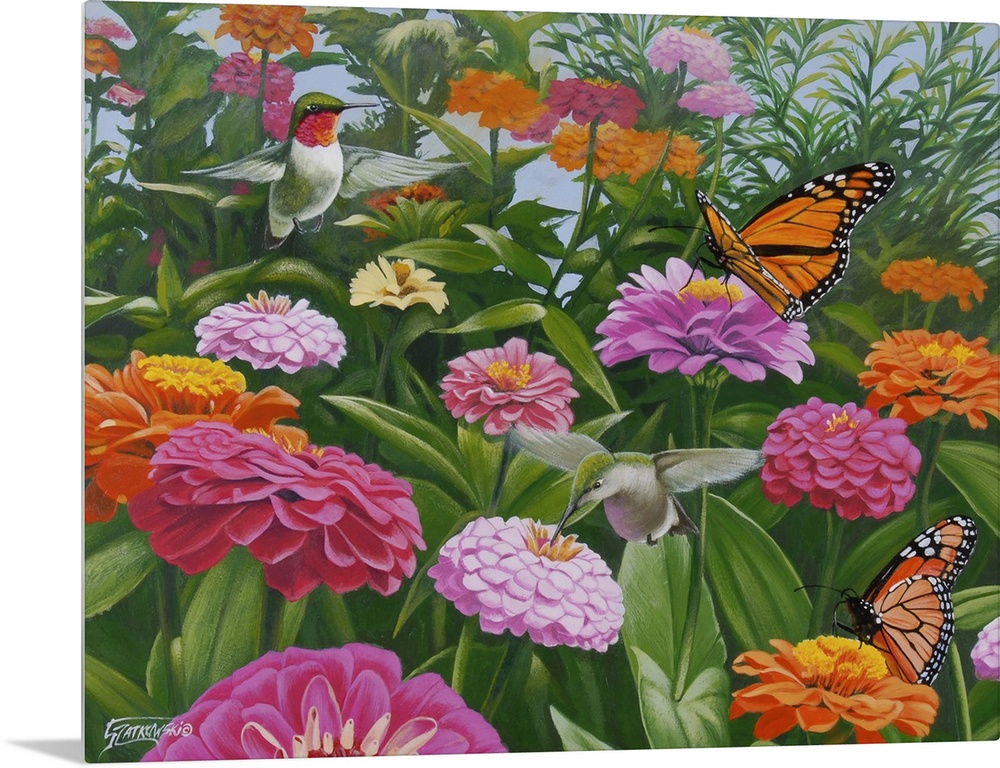<p>Contemporary painting of a monarch butterfly and a humming bird in a field of zinnia flowers.</p>