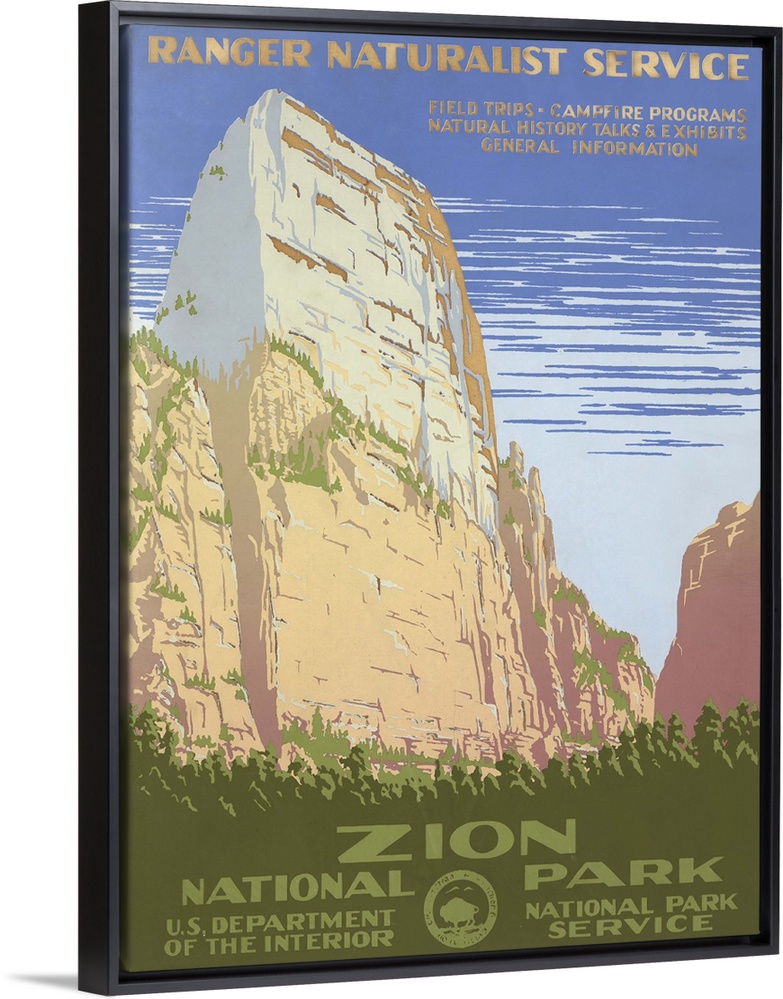 <p>Zion National Park, Ranger Naturalist Service. Poster shows view of a cliff at Zion National Park. Library of Congress, Prints and Photographs Division, WPA Poster Collection.</p>