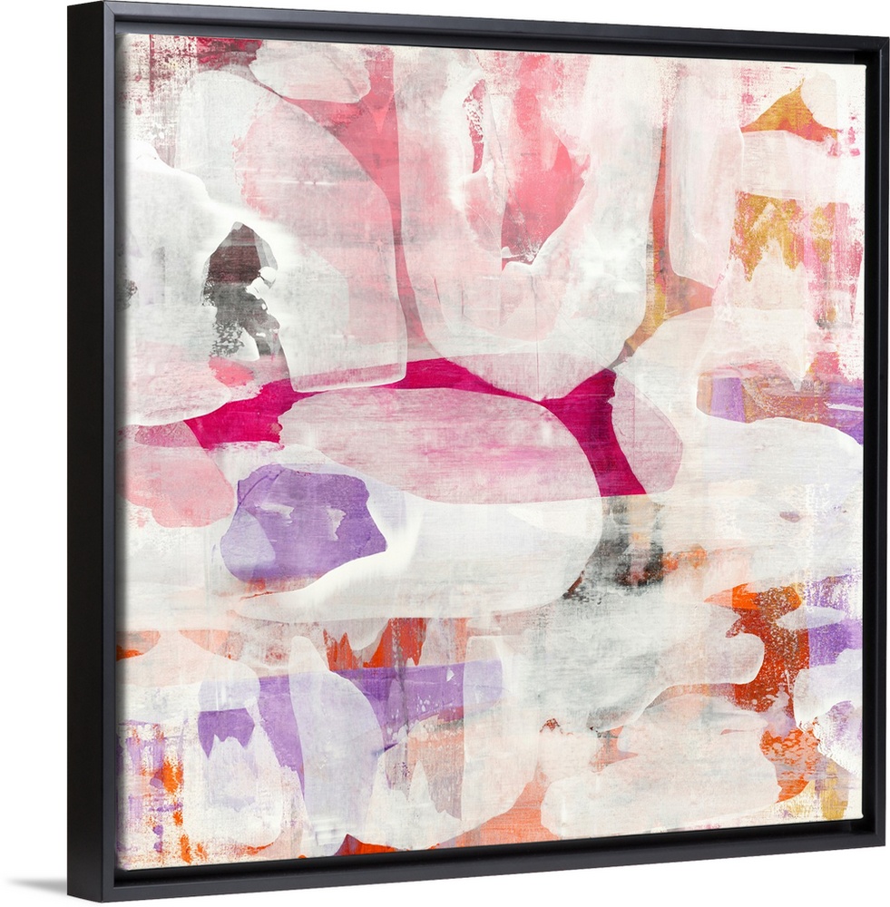 <p>A square, feminine, contemporary abstract painting with layers of white shapes overlapping tones of yellow, magenta and purple</p>