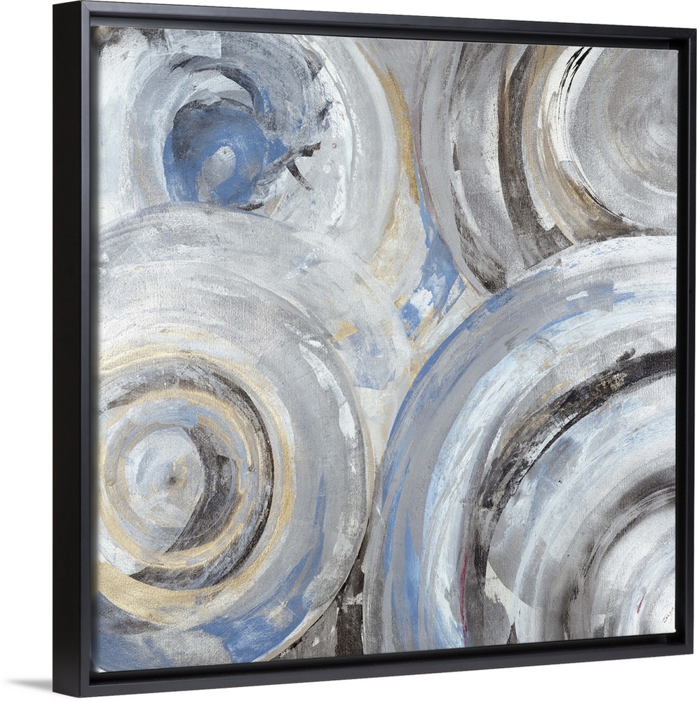 <p>Contemporary abstract painting of circle with concentric rings in light blue and gray tones.</p>