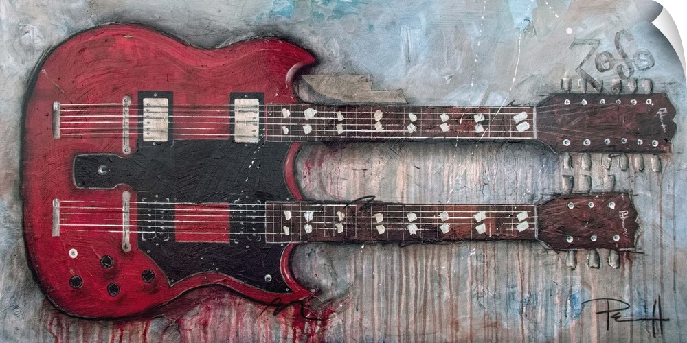 <p>Painting of a red double-necked electric guitar on an abstract background.</p>