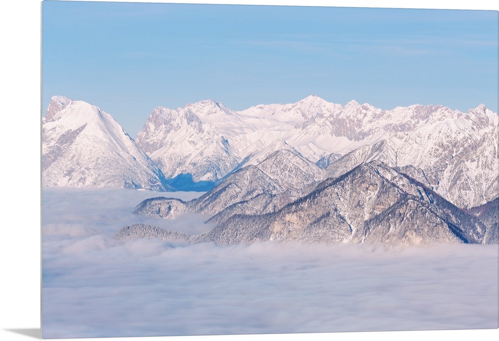 <p>The view over Zugspitze mountain on a foggy morning in the Inn valley, Patscherkofel mountain, Innsbruck Land, Tyrol, Austria.</p>