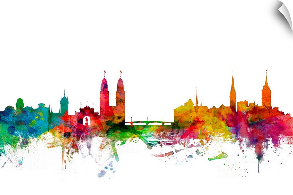 <p>Watercolor artwork of the Zurich skyline against a white background.</p>