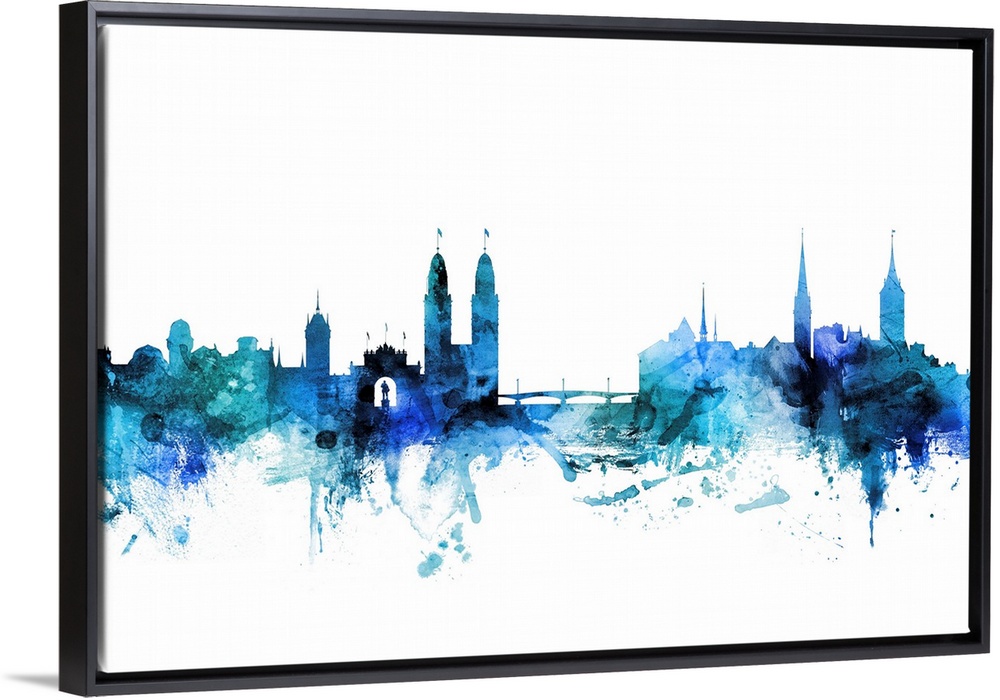 <p>Watercolor art print of the skyline of Zurich, Switzerland in shades of blue.</p>